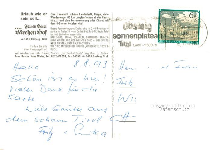 73649890 alte Postkarte Obsteig Tirol Ferien Hotel Laerchen Hof Teilansichten postalisch gelaufen Erhaltung siehe scans [WerneD78] KatCode: 11390334070213