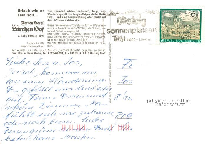 73268797 alte Postkarte Obsteig Tirol Ferienhotel Laerchen Hof postalisch gelaufen Erhaltung siehe scans [KathaD81] KatCode: 11390334070213