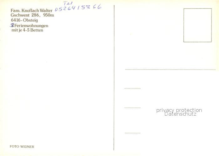 73065122 Obsteig Tirol Ferienwohnungen Fam. Knoflach Kuh Landschaftspanorama Alpen postalisch nicht gelaufen Erhaltung siehe scans [FriedD77] KatCode: 11390334070213