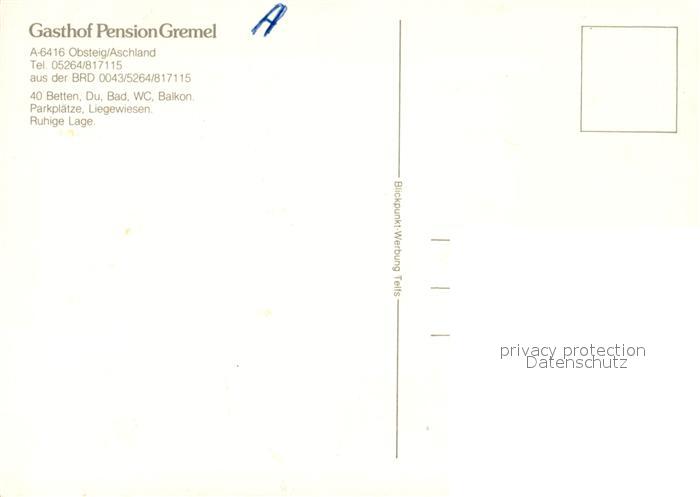 73522952 Obsteig Tirol Gasthaus Pension Gremel postalisch nicht gelaufen Erhaltung siehe scans [LiesaD40] KatCode: 11390334070213