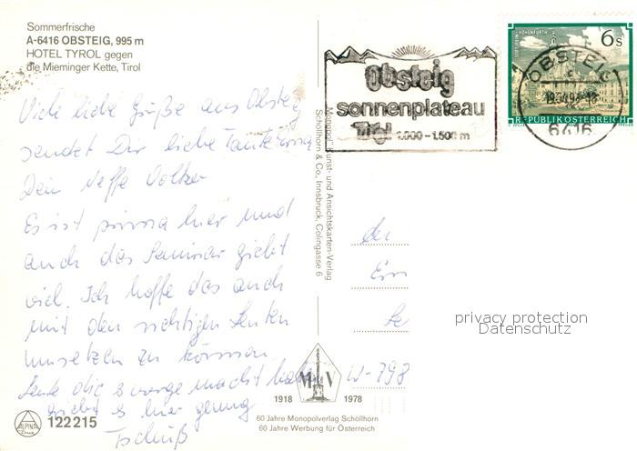 73477877 alte Postkarte Obsteig Tirol Hotel Tyrol gegen Mieminger Kette postalisch gelaufen Erhaltung siehe scans [FriedD77] KatCode: 11390334070213