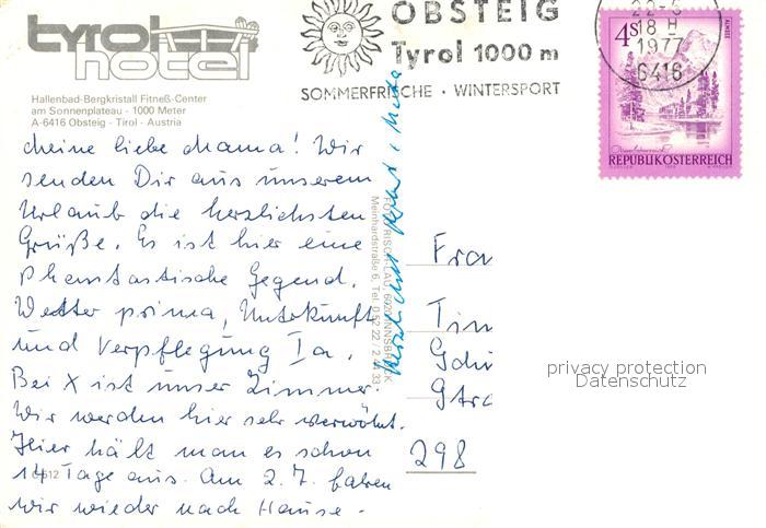 73045247 alte Postkarte Obsteig Tirol Hotel Tyrol Hallenbad Schwimmbad Gaestezimmer Ortsblick postalisch gelaufen Erhaltung siehe scans [WerneD78] KatCode: 11390334070213