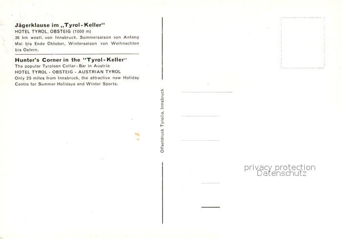 73328020 Obsteig Tirol Jaegerklause im Tyrol Keller Hotel Tyrol postalisch nicht gelaufen Erhaltung siehe scans [FriedD77] KatCode: 11390334070213