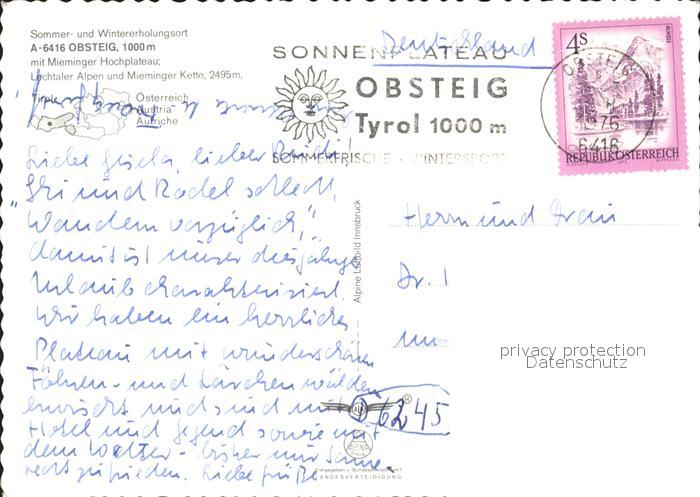 72057292 alte Postkarte Obsteig Tirol Mieminger Hochplateau Lechtaler Alpen Mieminger Kette Wappen Fliegeraufnahme postalisch gelaufen KatCode: 11390334070213