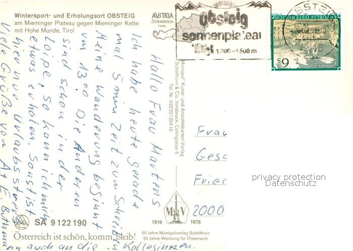 73610896 alte Postkarte Obsteig Tirol Panorama mit Mieminger Plateau Mieminger Kette und Hohe Munde postalisch gelaufen Erhaltung siehe scans [WerneD78] KatCode: 11390334070213