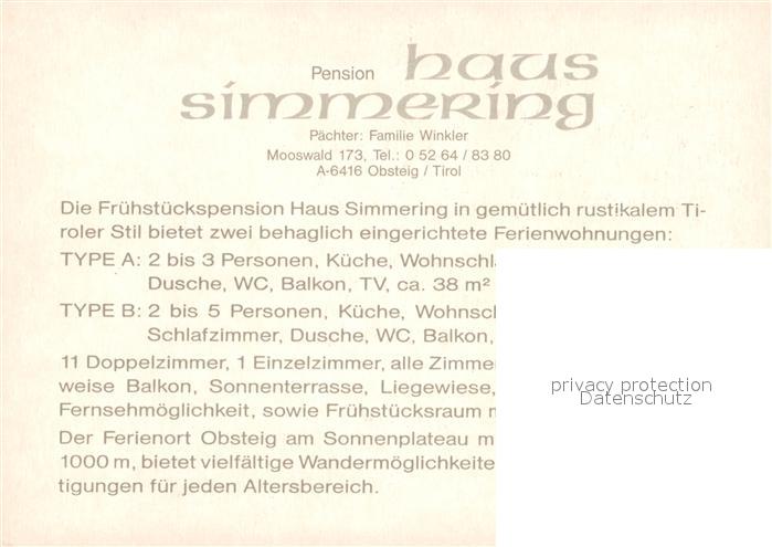 73244589 Obsteig Tirol Pension Garni Haus Simmering postalisch nicht gelaufen Werbekarte (keine Postkarte) Erhaltung siehe scans [FriedD77] KatCode: 11390334070213