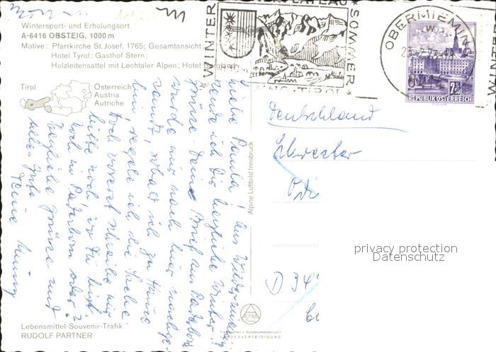 72492191 alte Postkarte Obsteig Tirol Pfarrkirche St. Josef Hotel Tyrol Gasthof Stern postalisch gelaufen Erhaltung siehe scans KatCode: 11390334070213