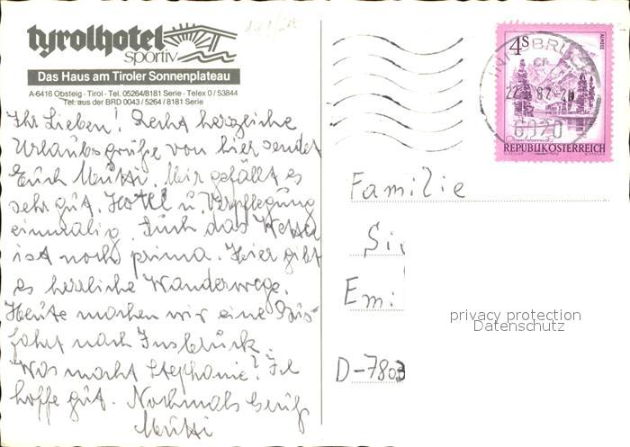 72492193 alte Postkarte Obsteig Tirol Tyrol Hotel Sportiv postalisch gelaufen Erhaltung siehe scans KatCode: 11390334070213
