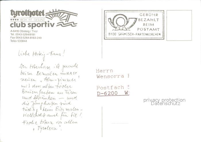 72530132 Obsteig Tirol Tyrolhotel postalisch nicht gelaufen Erhaltung siehe scans KatCode: 11390334070213