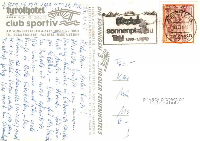 72756307 alte Postkarte Obsteig Tirol Tyrolhotel Club Sportiv postalisch gelaufen Erhaltung siehe scans [LiesaD40] KatCode: 11390334070213