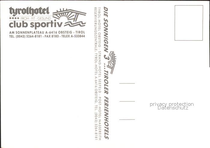 71902035 Obsteig Tirol Tyrolhotel Club Sportiv postalisch nicht gelaufen Erhaltung siehe scans KatCode: 11390334070213