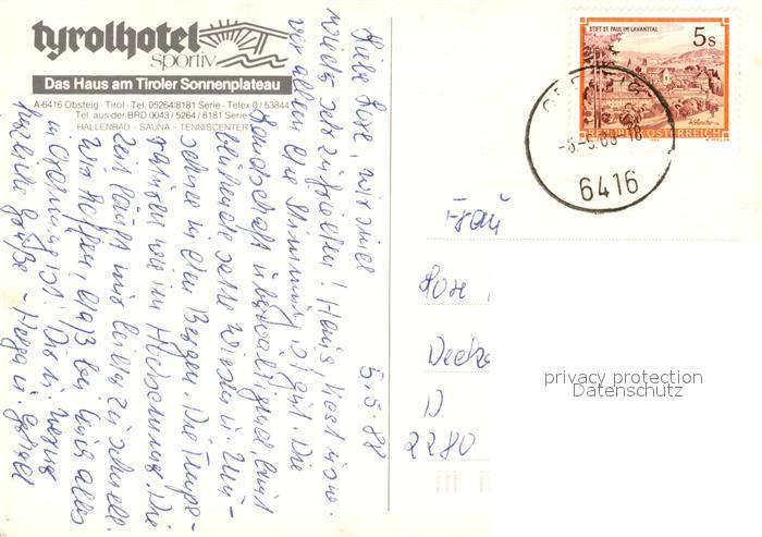 73231736 alte Postkarte Obsteig Tirol Tyrolhotel sportiv postalisch gelaufen Erhaltung siehe scans [LiesaD40] KatCode: 11390334070213