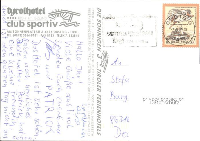 72226907 alte Postkarte Obsteig Tirol Tyrollhotel Sportiv postalisch gelaufen Erhaltung siehe scans KatCode: 11390334070213