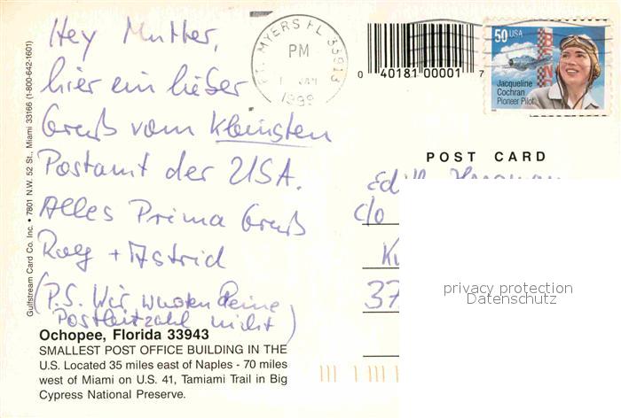 72772560 old postcard Ochopee Post Office postalisch gelaufen Erhaltung siehe scans [AndreD76] KatCode: 14140110000000