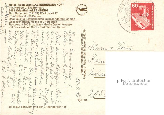 73656515 alte Postkarte Odenthal Hotel Restaurant Altenberger Hof mit Dom Fliegeraufnahme postalisch gelaufen Erhaltung siehe scans [WerneD78] KatCode: 11110005378020