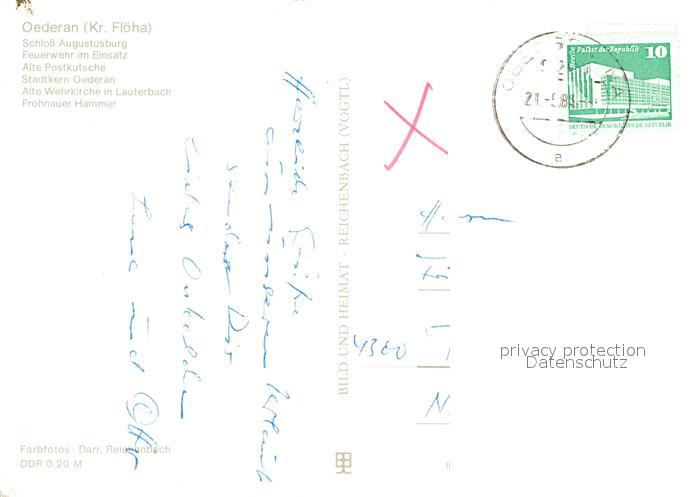 73013558 alte Postkarte Oederan Schloss Augustusburg Feuerwehr im Einsatz Alte Postkutsche Stadtkern Alte Wehrkirche Lauterbach Frohnauer Hammer postalisch gelaufen Erhaltung siehe scans [WerneD78] KatCode: 11110014177340