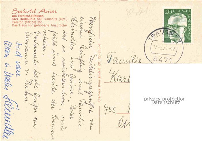 74050482 alte Postkarte oedmuehle Trausnitz Oberpfalz Seehotel Anzer am Pfreimd Stausee postalisch gelaufen Erhaltung siehe scans [WerneD78] KatCode: 11110009376173