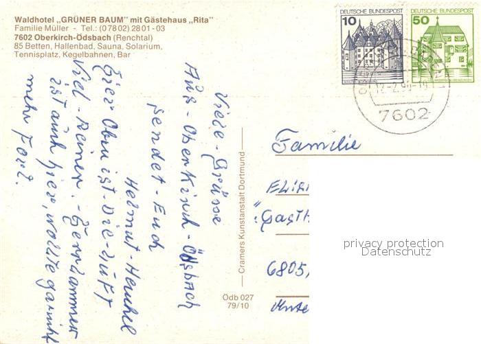 73070496 alte Postkarte oedsbach Waldhotel Gruener Baum Gaestehaus Rita postalisch gelaufen Erhaltung siehe scans [FriedD77] KatCode: 11110008317089