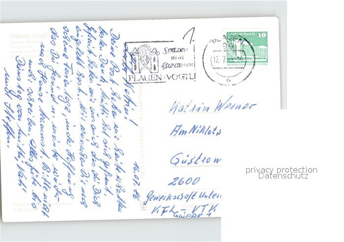 72413866 alte Postkarte Oelsnitz Vogtland Adorfer Strasse Kirche Teilansicht Strasse des Friedens Schloss Voigtsberg postalisch gelaufen Erhaltung siehe scans KatCode: 11110014178470