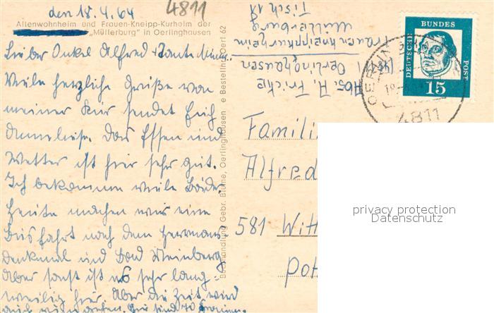 73695738 alte Postkarte Oerlinghausen Altenwohnheim und Frauen-Kneipp-Kurheim Muellerburg postalisch gelaufen Erhaltung siehe scans [LiesaD40] KatCode: 11110005766056