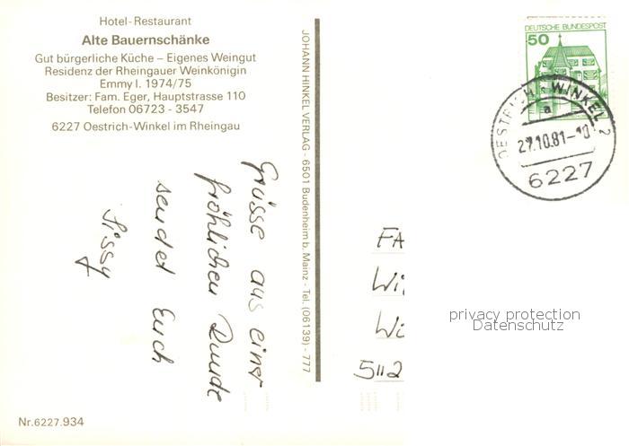 73845596 alte Postkarte Oestrich-Winkel Hotel Restaurant Alte Bauernschaenke Gastraeume postalisch gelaufen Erhaltung siehe scans [FriedD77] KatCode: 11110006439012