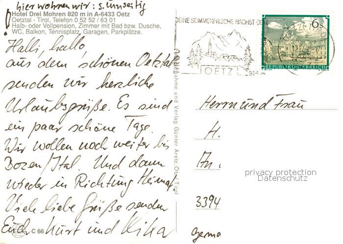 73526151 alte Postkarte Oetz Hotel Drei Mohren oetztal oetztaler Alpen postalisch gelaufen Erhaltung siehe scans [FriedD77] KatCode: 11390334070214