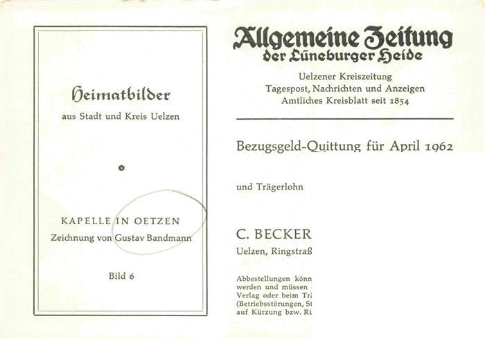 74014772 Oetzen Uelzen Niedersachsen Kapelle Zeichnung Bezugsgeld Quittung postalisch nicht gelaufen Erhaltung siehe scans [WerneD78] KatCode: 11110003360015