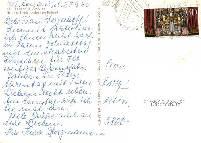 72867667 alte Postkarte Offenbach Main Berliner Strasse Anlage am Parkbad Brunnen postalisch gelaufen Erhaltung siehe scans [WerneD78] KatCode: 11110006413000