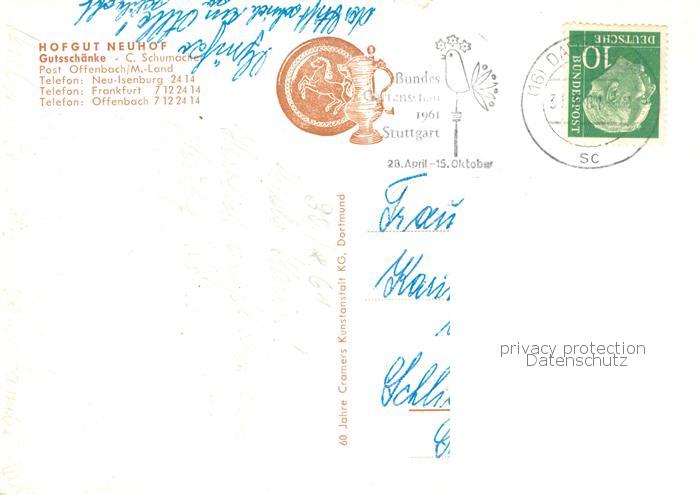 73780127 Offenbach Main Hofgut Neuhof Gutsschaenke postalisch gelaufen Erhaltung siehe scans [FriedD77] alte Postkarte Frie Katcode 11110006413000