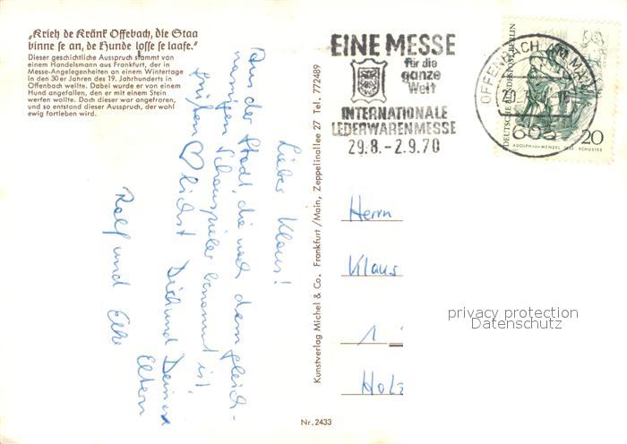 73600576 alte Postkarte Offenbach Main Krieh de Kraenk Offebach die Staa binne se an, die Hunde losse se laafe! Spruch Karikaturen postalisch gelaufen Erhaltung siehe scans [FriedD77] KatCode: 11110006413000