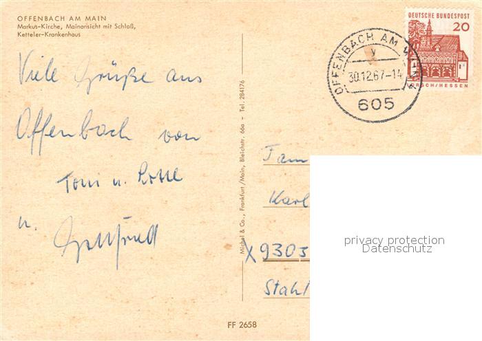 73600573 alte Postkarte Offenbach Main Markuskirche Mainansicht mit Schloss Ketteler Krankenhaus postalisch gelaufen Erhaltung siehe scans [FriedD77] KatCode: 11110006413000