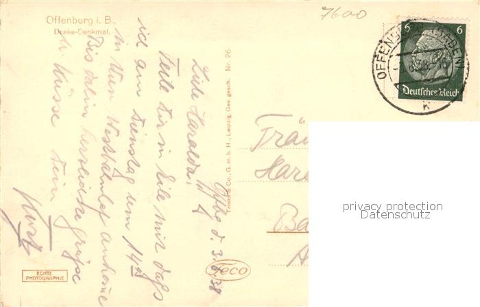 43348607 alte Postkarte Offenburg Drake Denkmal postalisch gelaufen Erhaltung siehe scans [KathaD81] KatCode: 11110008317096