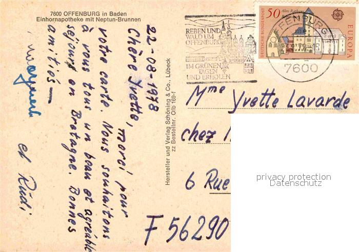72616486 alte Postkarte Offenburg Einhornapotheke mit Neptunbrunnen postalisch gelaufen Erhaltung siehe scans [FriedD77] KatCode: 11110008317096