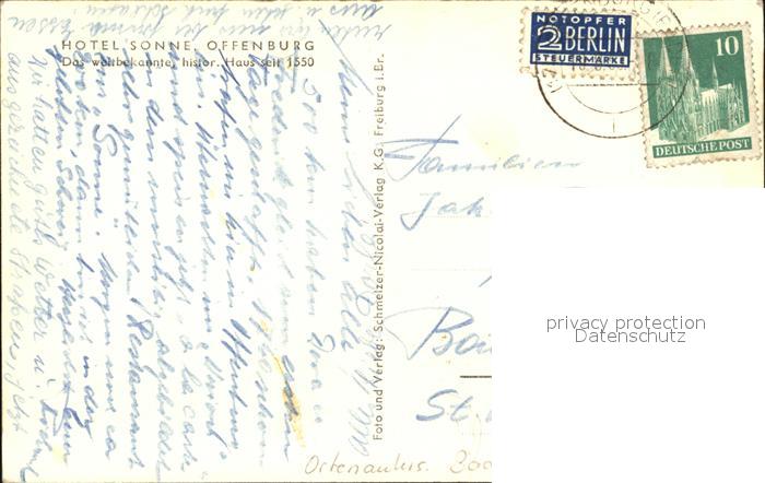 32571015 alte Postkarte Offenburg Hotel Sonne postalisch gelaufen Erhaltung siehe scans [WerneD78] KatCode: 11110008317096