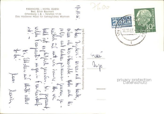 31727572 alte Postkarte Offenburg Parkhotel Garni postalisch gelaufen Erhaltung siehe scans KatCode: 11110008317096