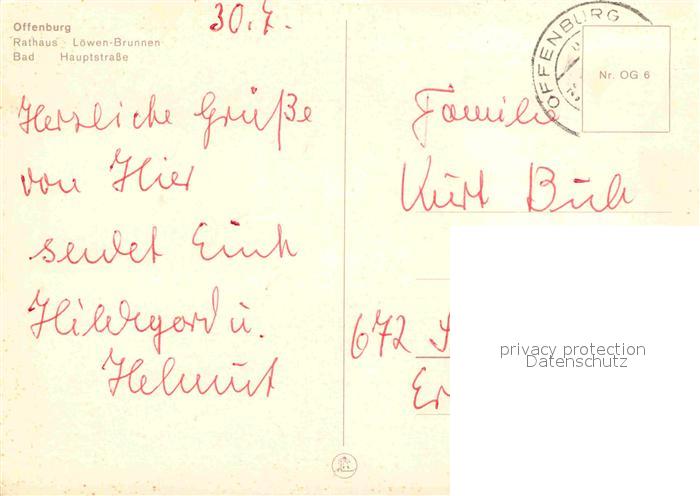 72904748 alte Postkarte Offenburg Rathaus Loewenbrunnen Bad Hauptstrasse postalisch gelaufen Erhaltung siehe scans [AndreD76] KatCode: 11110008317096
