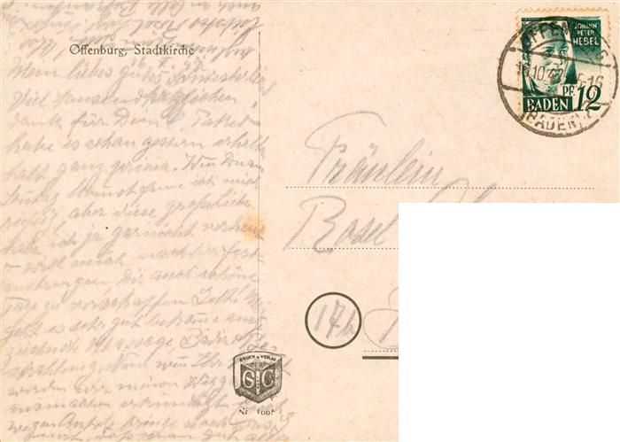 73876933 alte Postkarte Offenburg Stadtkirche postalisch gelaufen Erhaltung siehe scans [FriedD77] KatCode: 11110008317096