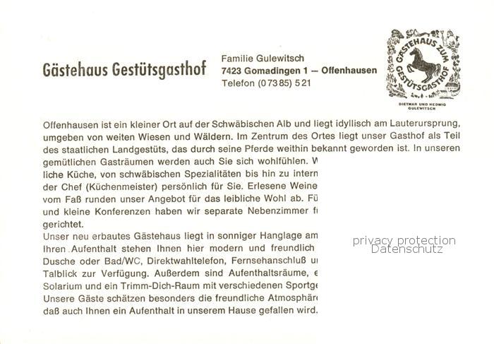 73836511 Offenhausen Gomadingen Gaestehaus Gestuetsgasthof postalisch nicht gelaufen Werbekarte (keine Postkarte) Erhaltung siehe scans [WerneD78] KatCode: 11110008415027