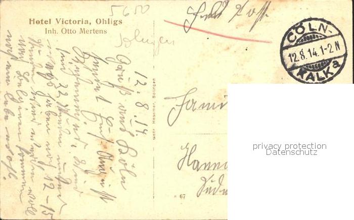 31884857 alte Postkarte Ohligs Hotel Victoria postalisch gelaufen Feldpost Erhaltung siehe scans KatCode: 11110005122000