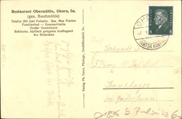 30727348 alte Postkarte Ohorn Restaurant Obermuehle postalisch gelaufen KatCode: 11110014292400