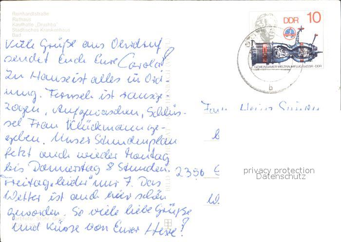 72337139 alte Postkarte Ohrdruf Reinhardtstrasse Rathaus Kaufhalle Drushba Krankenhaus Schwimmbad postalisch gelaufen Erhaltung siehe scans KatCode: 11110016067053