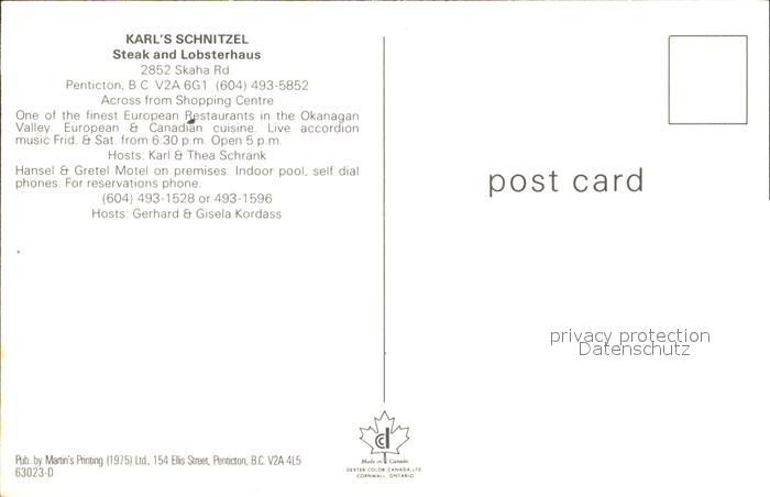 Okanagan Falls Karls Schnitzel Steak and Lobsterhaus postalisch nicht gelaufen Erhaltung siehe scans