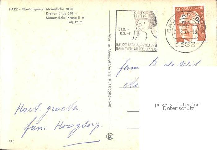 72306191 alte Postkarte Okertalsperre postalisch gelaufen Erhaltung siehe scans KatCode: 11110003153005