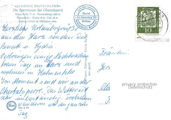 74154721 alte Postkarte Okertalsperre Goslar Sperrmauer postalisch gelaufen Erhaltung siehe scans [WerneD78] KatCode: 11110003153005