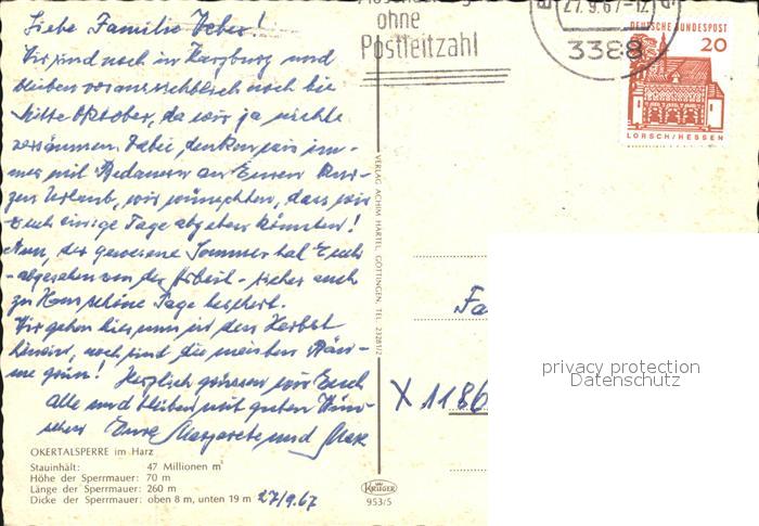 72579259 alte Postkarte Okertalsperre Sperrmauer postalisch gelaufen Erhaltung siehe scans [LiesaD40] KatCode: 11110003153005