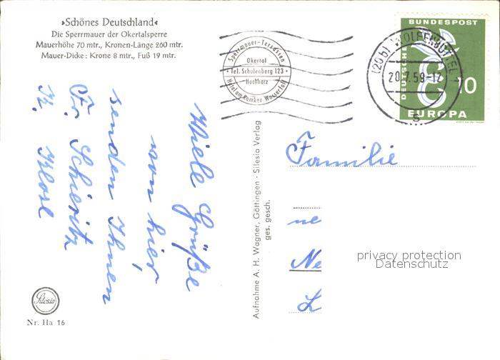 72232727 alte Postkarte Okertalsperre Sperrmauer Stausee Serie Schoenes Deutschland postalisch gelaufen Erhaltung siehe scans KatCode: 11110003153005