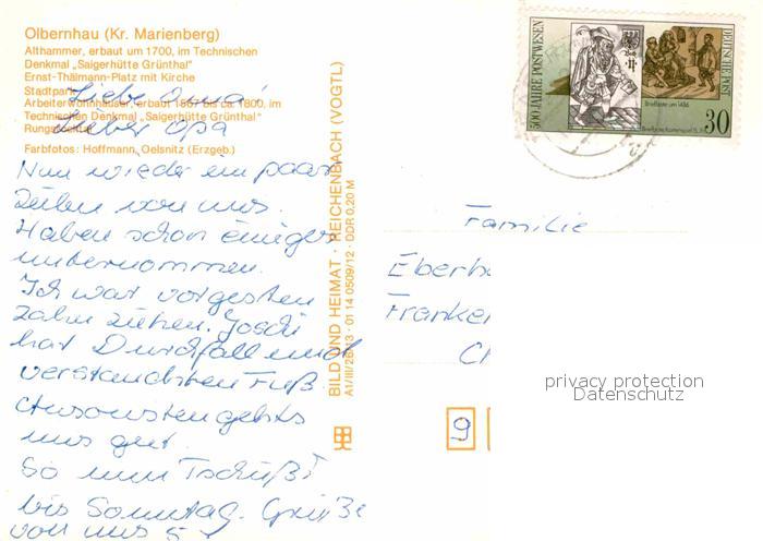 72617442 alte Postkarte Olbernhau Erzgebirge Althammer Denkmal Saigerhuette Gruenthal Thaelmann Platz mit Kirche Stadtpark Rungstocktal postalisch gelaufen Erhaltung siehe scans [WerneD78] KatCode: 11110014181280