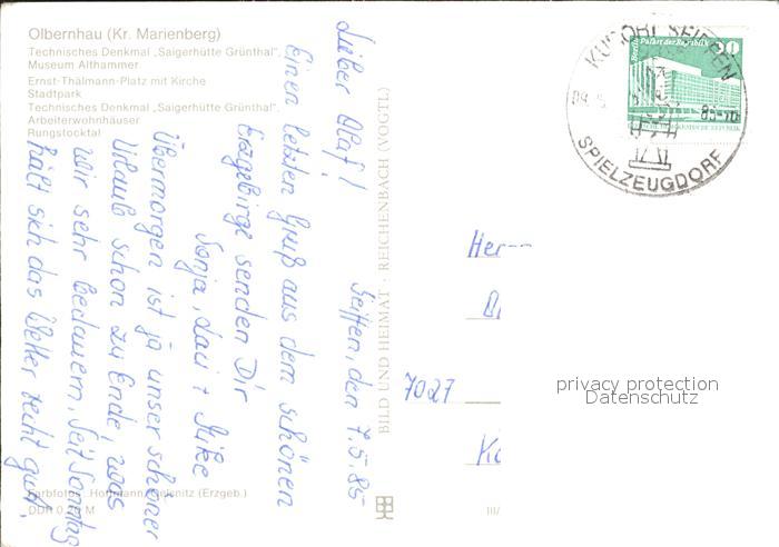 72125925 alte Postkarte Olbernhau Erzgebirge Saigerhuette Gruenthal Museum Althammer Ernst Thaelmann Platz Kirche Stadtpark postalisch gelaufen Erhaltung siehe scans KatCode: 11110014181280