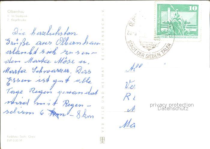 72054796 alte Postkarte Olbernhau Erzgebirge Stadtpark Kegelbruecke postalisch gelaufen Erhaltung siehe scans KatCode: 11110014181280