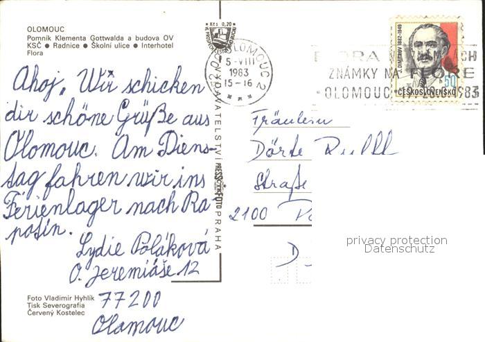old postcard Olomouc Pomnik Klementa Gottwalda a budova OV KSC Radnice Skolni ulice Interhotel Flora postalisch gelaufen Erhaltung siehe scans